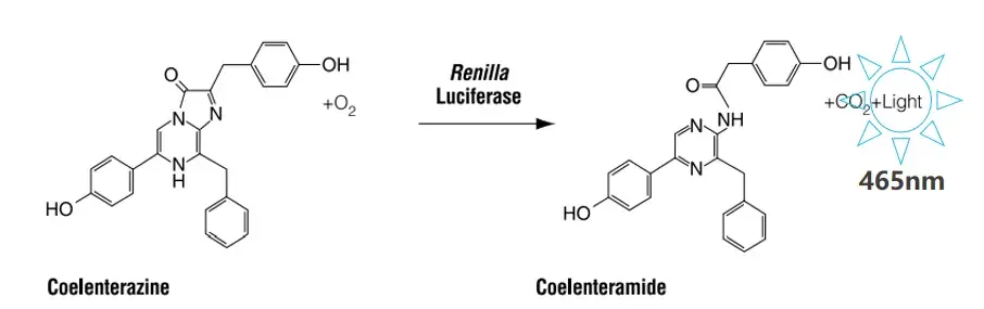海肾荧光素酶催化的发光反应需要腔肠素和O2的参与,发光颜色为蓝色。